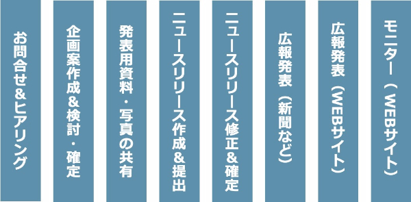 ・ニュースリリース作成、広報発表(新聞・雑誌・テレビや WEB サイト)、WEB モニターまで、基本的な支援業務を